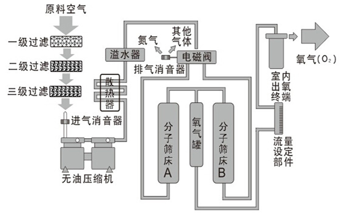 以空气为原料,采用变压吸附技术,利用氧气标准达到医用氧水平在加压状态下对氮的吸附容量增加,减压时对氮的吸附容量减少的特性,形成加压吸附、减压脱附的循环过程,实现空气中氧、氮的分离,连续制取弥散使用的氧气,氧气质量较高。